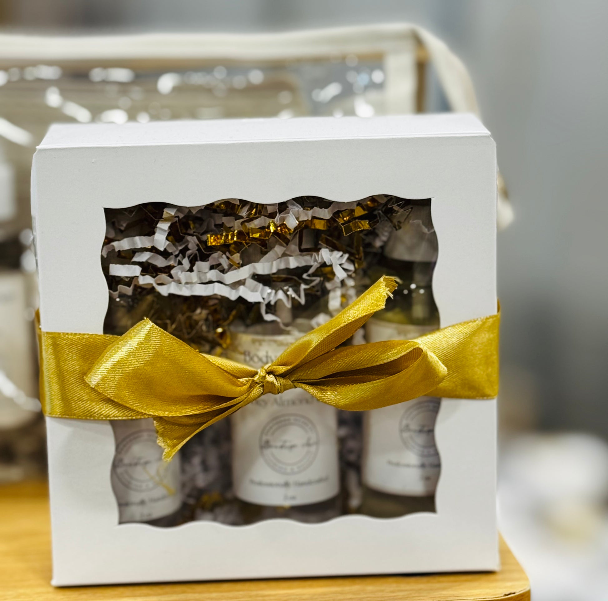 A ready-made, stress free gift set and a great stocking stuffer! Includes a 3 Piece Travel Size Body & Linen Spray product set, a beautiful luxe presentation, and a matching gold gift bag!